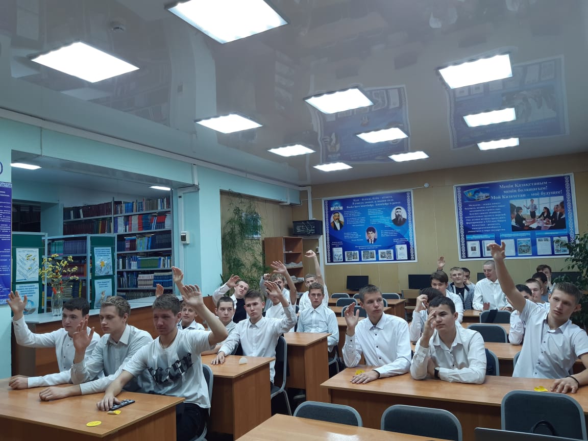 Патриоттық сағат зияткерлік викторина түрінде өтті, оның барысында студенттер туған өлкенің тарихы, Республика үшін айтулы күндер, ұлттық дәстүрлер, әдебиет және мәдениет бойынша жоғары білім деңгейін көрсетті.