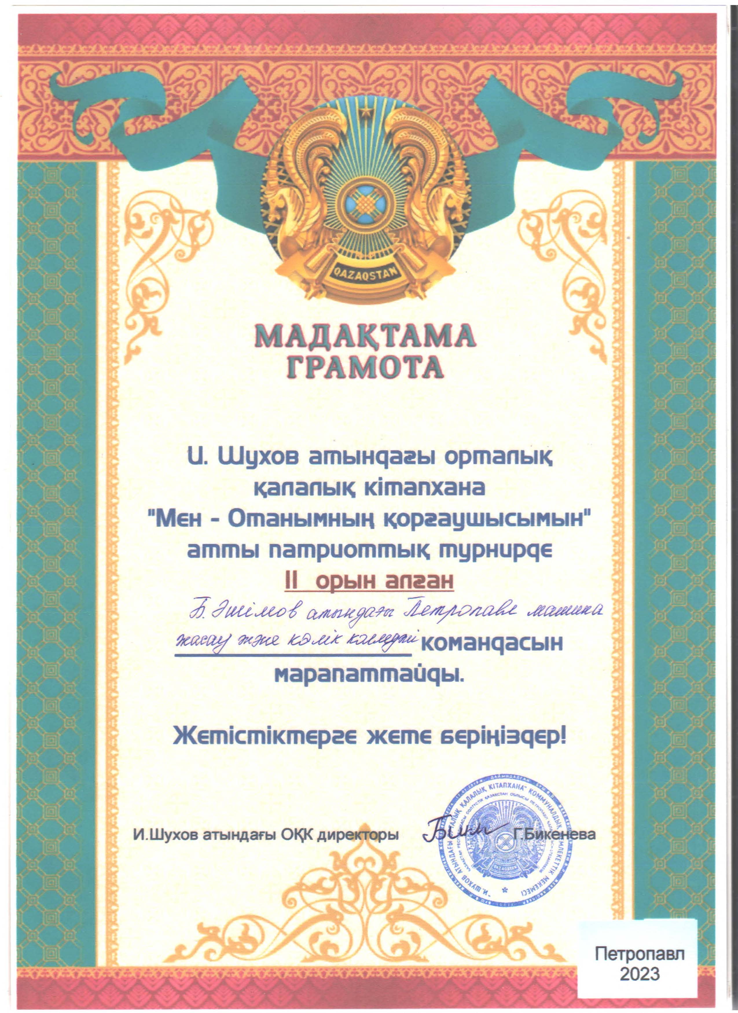 2023 жылдың 4 мамырында Б. Әшімов атындағы Петропавл машина жасау және көлік колледжінің студенттері Отан қорғаушылар күніне арналған "Мен-Отанымның қорғаушысымын!" тақырыбындағы патриоттық турнирге қатысты. Іс-шараны И.Шухов атындағы Орталық қалалық кітапхана өткізді. Біздің колледждің "Аппарат" атты командасы Қазақстан тарихы бойынша өз білімдерін көрсетіп, өзін айқын көрсетіп, 2-орынға ие болды. Кітапханашылар қонақтарға жас ұрпақты патриоттық тәрбиелеуге белсенді қатысқаны үшін алғыстарын білдірді.