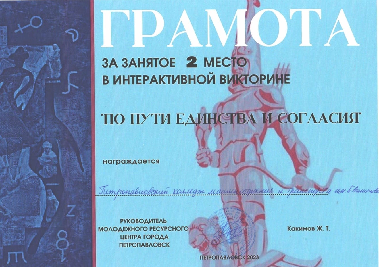 Б. Әшімов атындағы Петропавл машина жасау және көлік колледжінің командасы "Достық" 2 орынға ие болды. Викторинаға 1 және 2 курс студенттері: Волкова Наталья (Д-11), Рахимов Нурбек (ПО-11), Скачкова Софья (ПО-11), Усенов Адилхан (Т-21), Хотько Евгений (Э-11) қатысты.