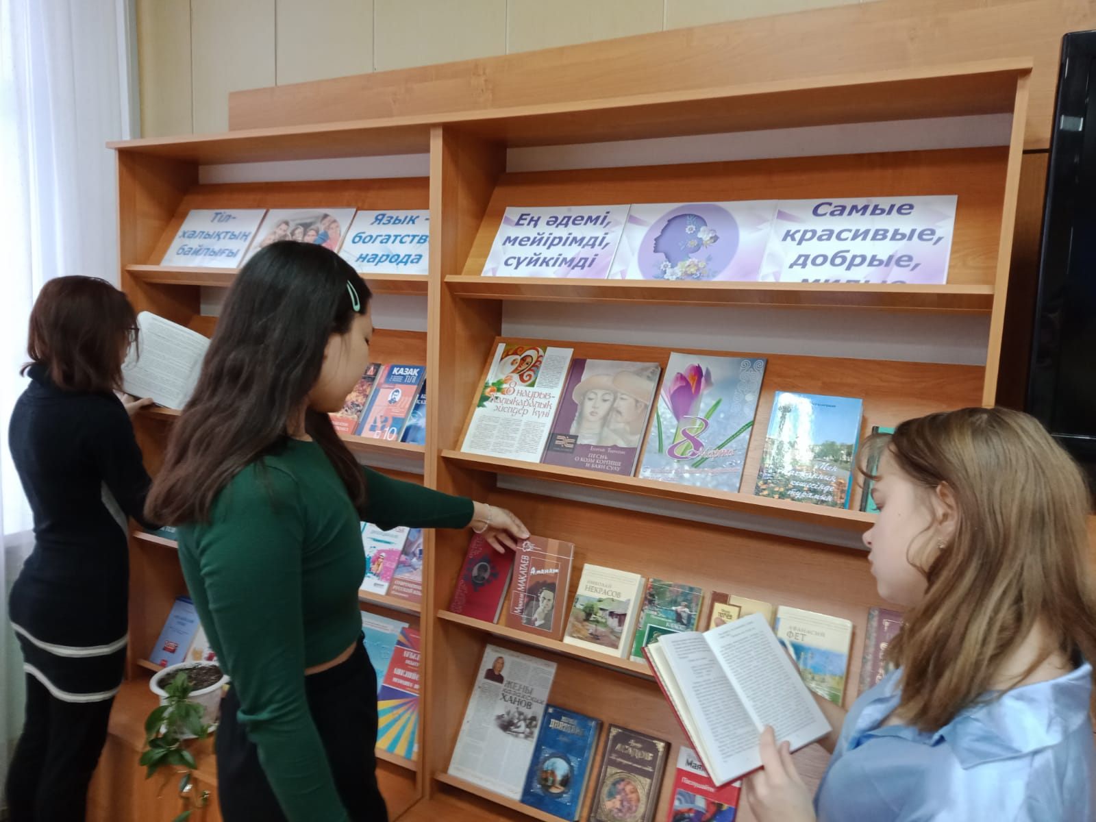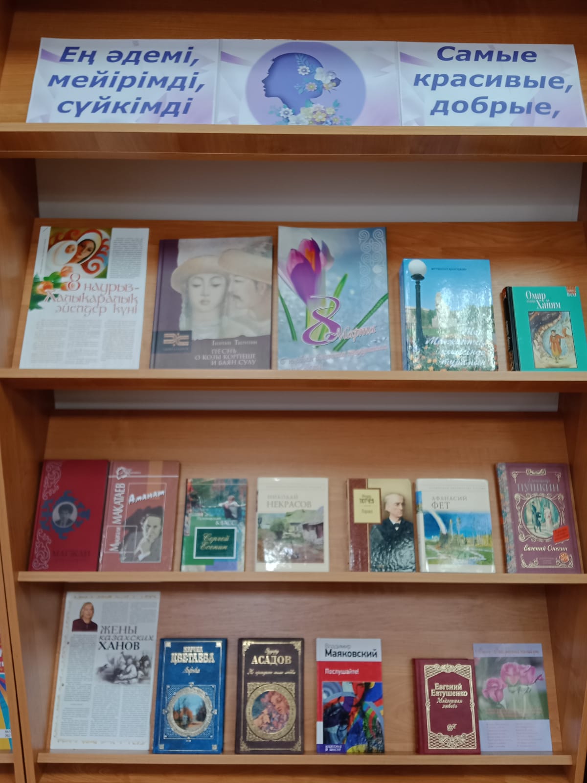 Көктеммен бірге бізге тамаша және тамаша мереке – 8 наурыз Халықаралық әйелдер күні келді. Адамзаттың ең жақсы, ең әдемі, ең сүйкімді жартысы үшін мереке. Көрмеге қойылған кітаптар мерекенің тарихынан сыр шертеді, көрнекті ақын-жазушылардың әйел сұлулығы мен сүйкімділігі, бақыт пен келісім, көктем мен махаббат туралы шығармалары.