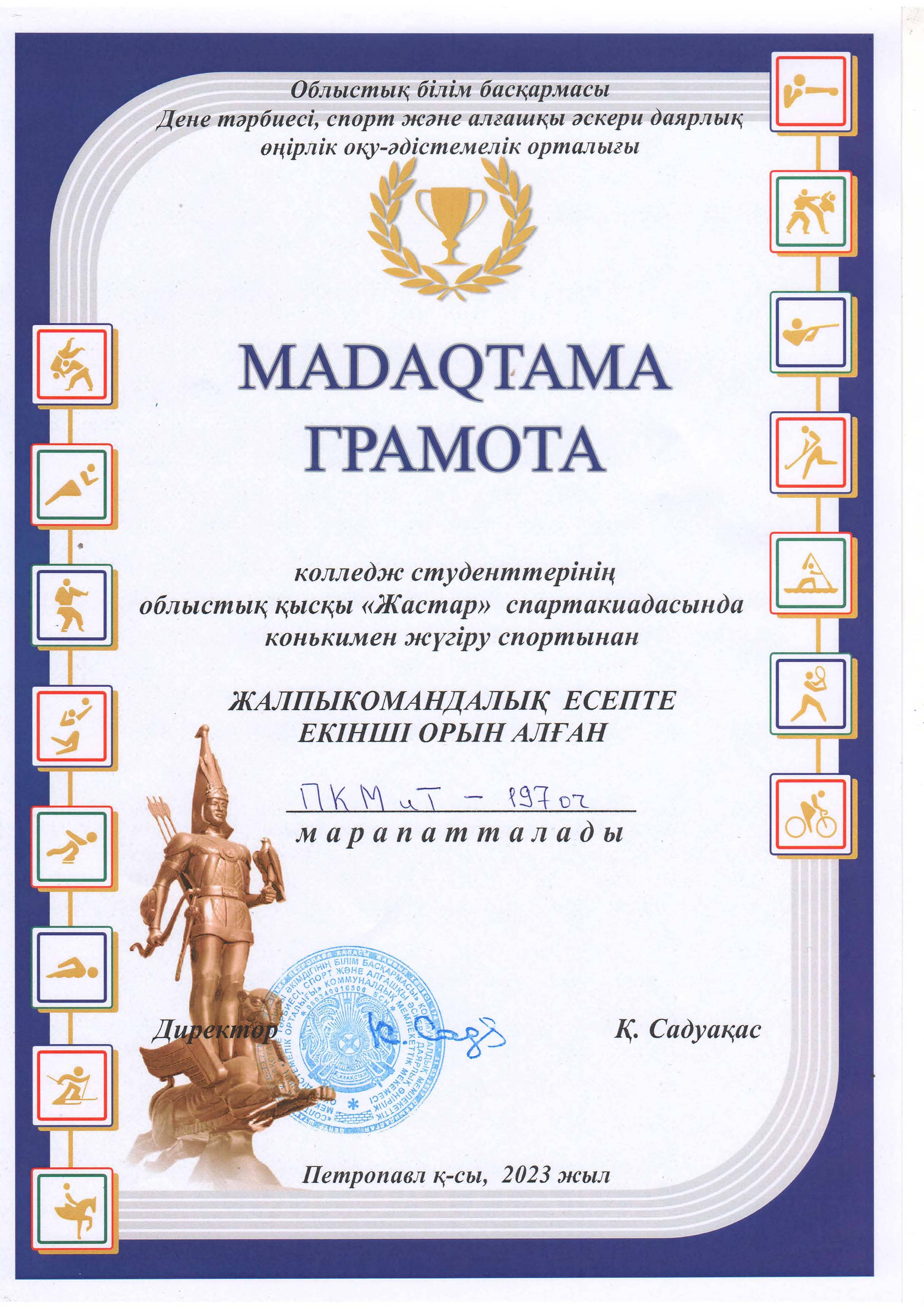 2023 жылғы 7 ақпанда Б. Әшімов атындағы Петропавл машина жасау және көлік колледжінің командасы Солтүстік Қазақстан облысы колледждерінің студенттері арасында "Сұңқар" облыстық спартакиадасы шеңберінде "Қарасай" стадионында өткен конькимен жүгіру спортынан жарыстарда жалпы командалық 2 орынға ие болды.