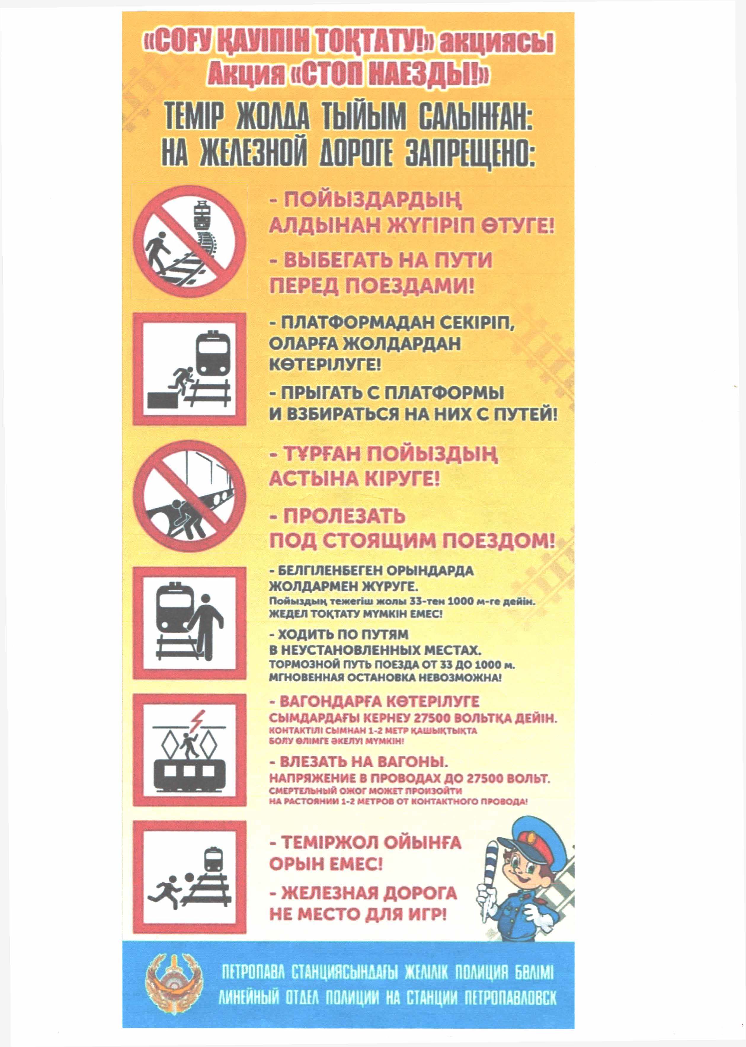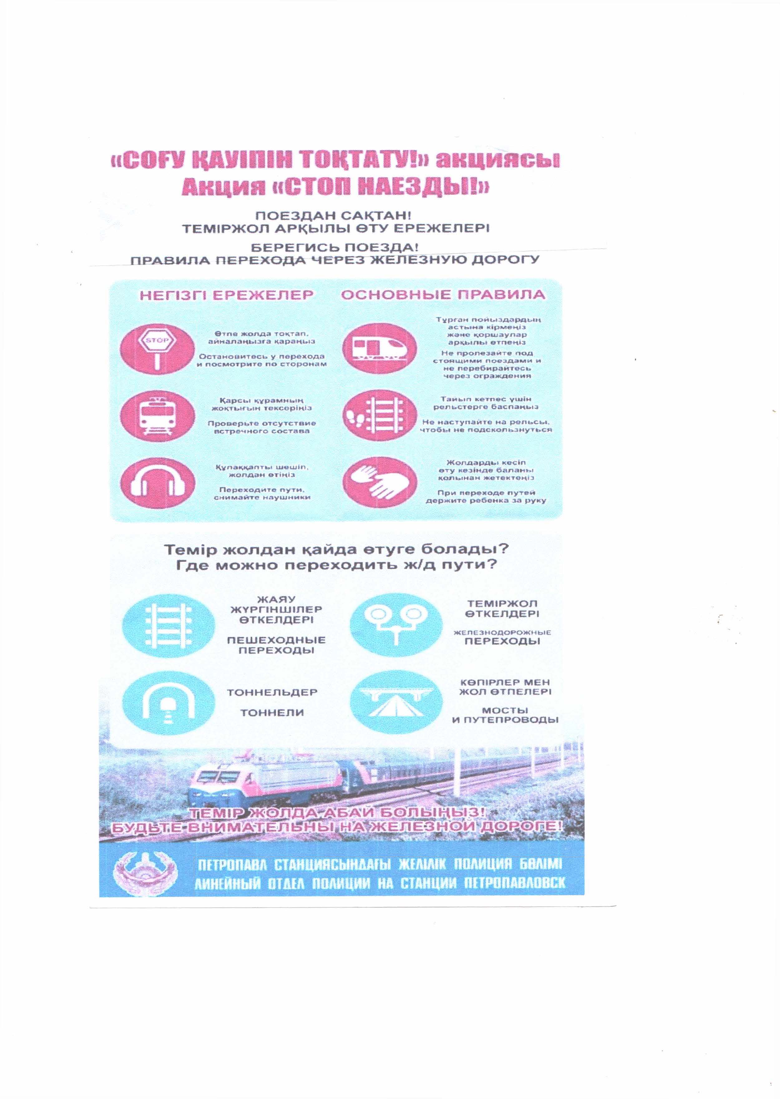 Волонтерлер вокзал жолаушыларына ақпараттық парақшалар таратып, оларға қауіпсіз жүріс-тұрыстың негізгі ережелерін түсіндірді: жолдарды тек жаяу жүргіншілер өткелдері, туннельдер немесе көпірлер арқылы кесіп өту; пойызға жақындағанда сақ болыңыз; теміржол жолдарын кесіп өткенде құлаққаптар мен ұялы телефондарды пайдалануға жол бермеу және т.б.