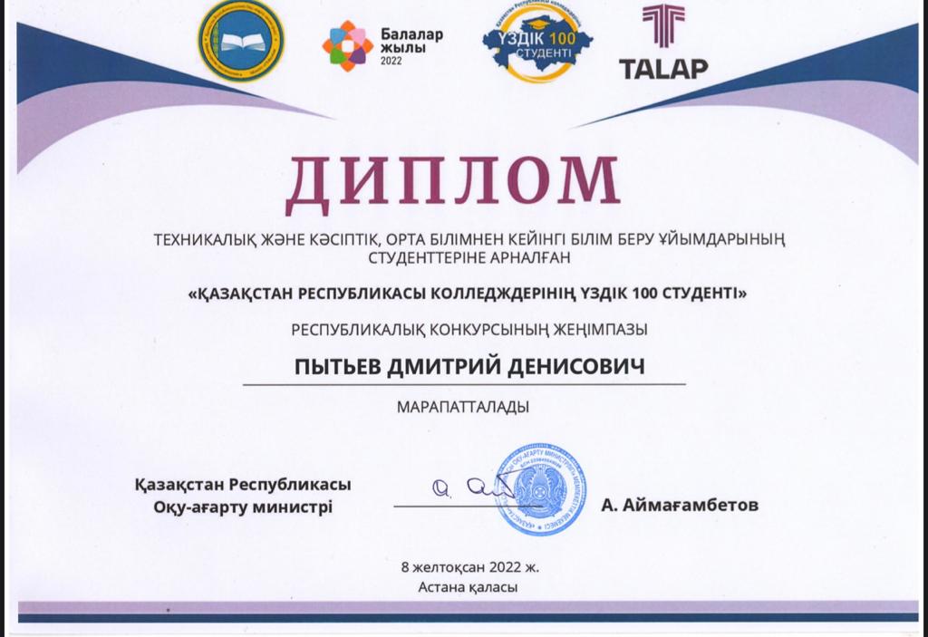 Қазақстанда төртінші жыл ТОП-100 үздік колледж студенттері өтуде! Биылғы жыл ерекше, салтанатты шараға Қазақстан Республикасының Білім министрі Асхат Қанатұлы Аймағамбетов қатысты. Бұл балалар мен бүкіл ТжКБ жүйесі үшін мағыналы және маңызды болды. Дмитрий Пытьевті «Қазақстан Республикасының ТОП 100 колледж студенті» республикалық байқауындағы жеңісімен құттықтаймыз және одан әрі табыс тілейміз!
