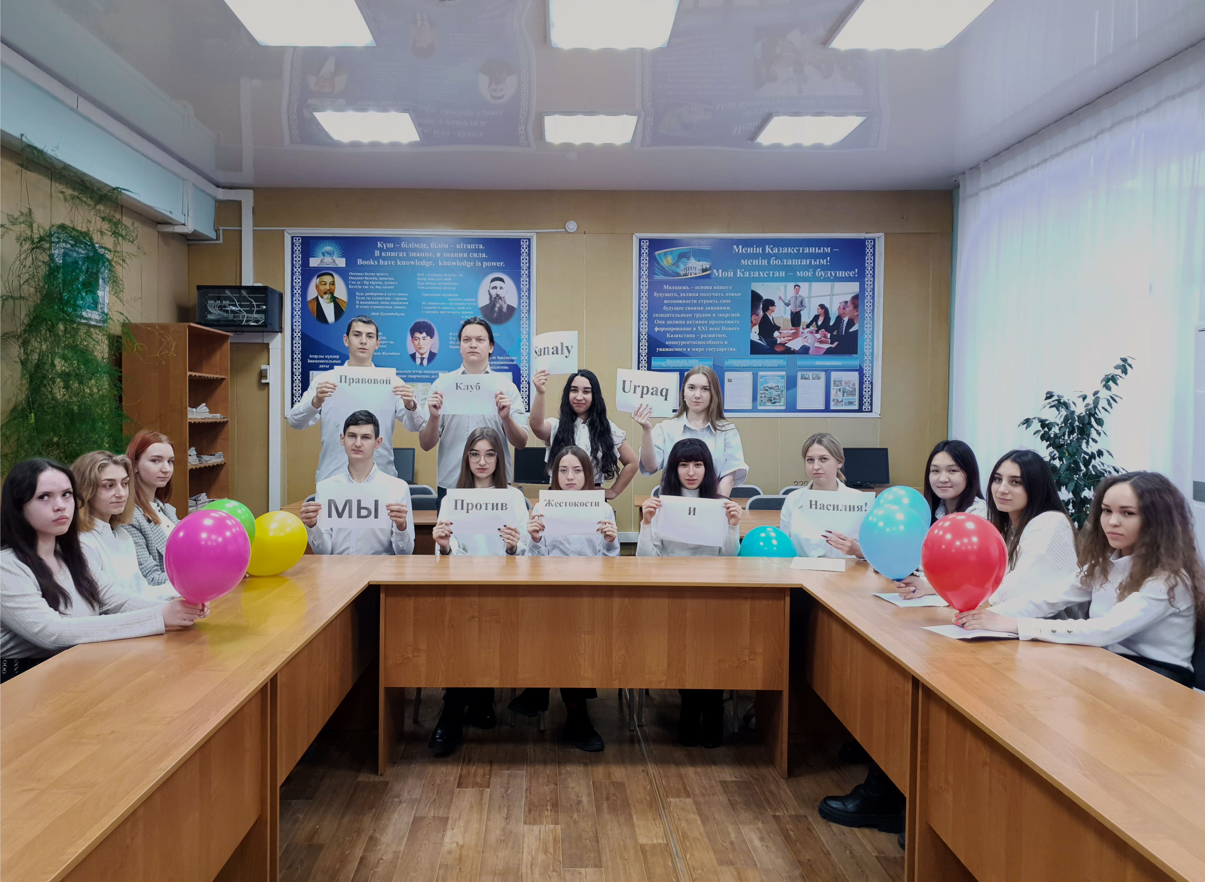 2022 жылғы 18 қарашада "Sanaly urpaq" құқықтық клубы балалар мен жасөспірімдерге қарсы зорлық-зомбылық мәселелеріне арналған іс-шара өткізді. Балаларға қатысты қорлаудың, қорлаудың және физикалық қолсұғушылықтың кез келген түрінен бас тарту акциясы Қазақстан Республикасының барлық өңірлерінде 2022 жылдың қараша айының ішінде өтуде. Өкінішке орай, жас ұрпақ көшеде, отбасында және қоғамдық орындарда агрессия фактілеріне тап болады. Зорлық-зомбылық-бұл басқа адамға билік пен бақылауды орнату және сақтау мақсатында бір адамды мәжбүрлеудің әртүрлі формаларын қолдануға негізделген мінез-құлық жүйесі.