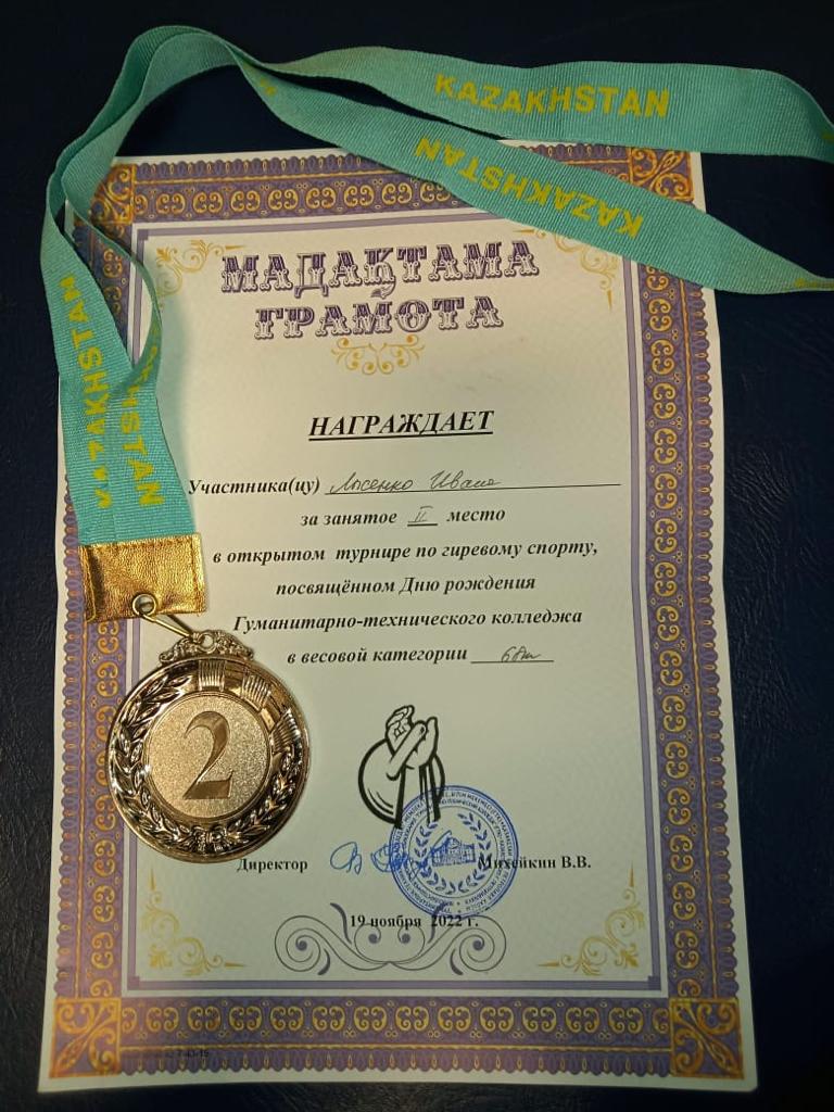ДСП-31 тобының студенті Иван Лысенконы гуманитарлық-техникалық колледжі ұйымдастырған гір көтеруден ашық турнирде 2-орын алуымен құттықтаймыз.