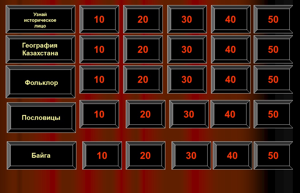 Ойын бірнеше сайыстардан тұрды: бәйге, тарихи тұлғаны анықтау, Қазақстан географиясы, халық ауыз әдебиеті, мақал- мәтелдер. Викторина сұрақтары мемлекетіміздің түрлі тарихи кезеңдерін қозғады.