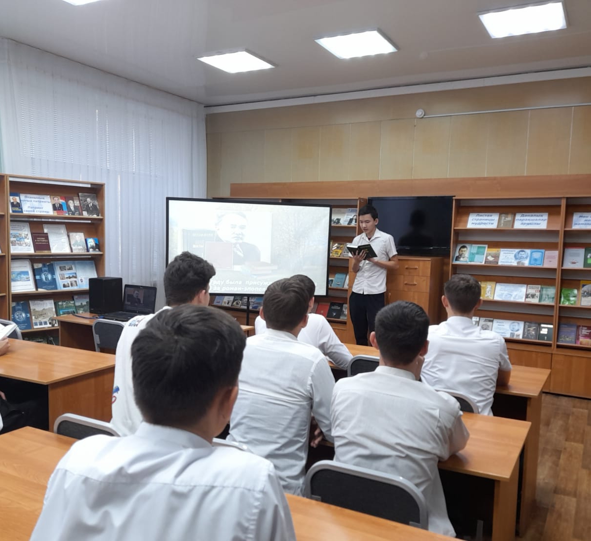 Клуб отырысында слайдтар көрсетілді, "Ходжей руынан шыққан Классик "Мұхтар Әуезов" бейнефильмі, "Балалық шақ" бейнеролигі Ә.Еңсепов, "Жан - аға" Н.Өнербаев көрсетілді. Студенттер өлеңдер оқып, "Тарихқа енген тұлға" викторинасына белсенді қатысты. Кітапхананың оқу залында "Аңыз адам "атты кітап көрмесі ұйымдастырылды.
