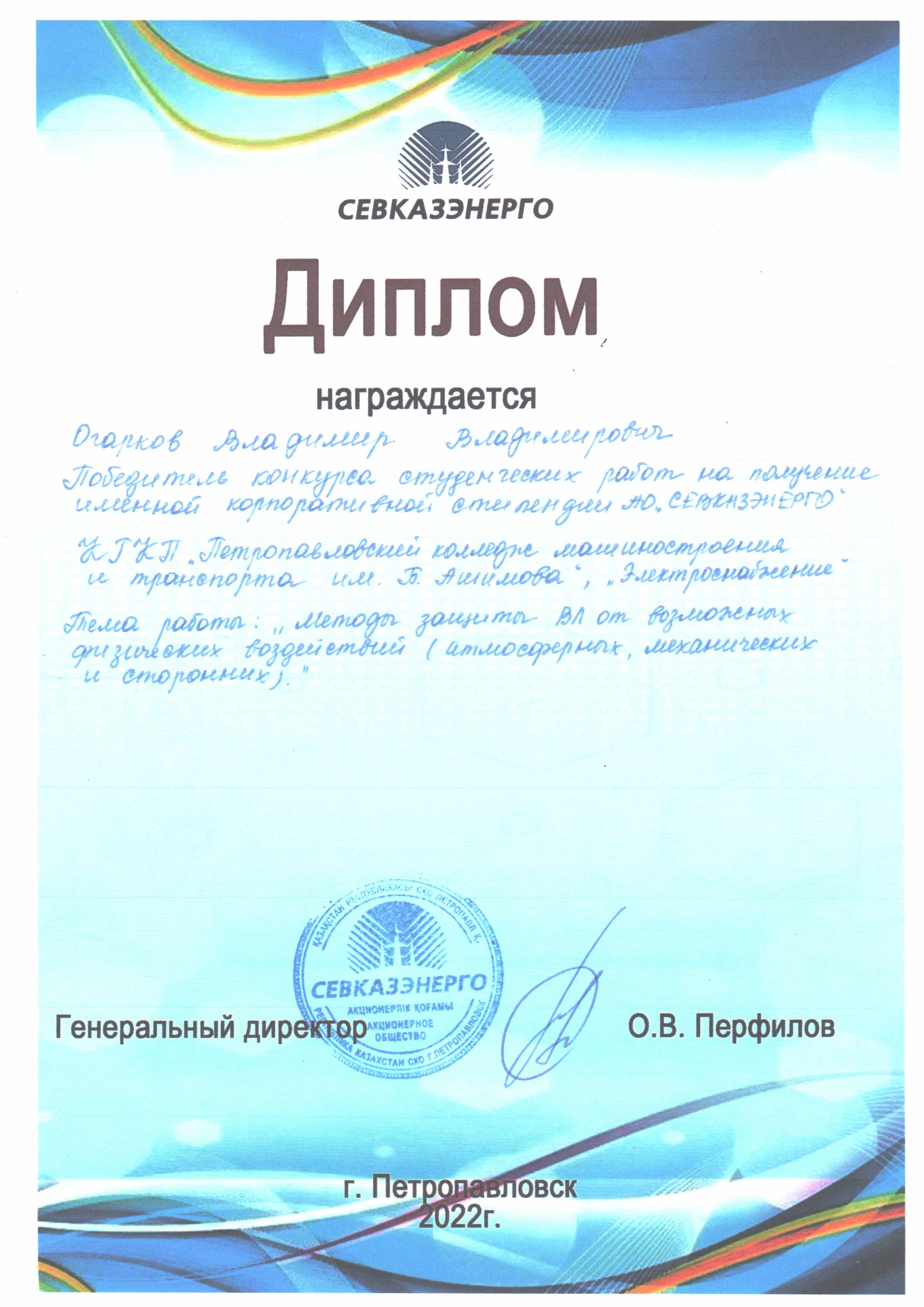 2022 жылдың 20 қыркүйегінде Б.Әшімов атындағы Петропавл машина жасау және көлік колледжінің ЭМО-41 тобының 4 курс студенті Огарков Владимир "СЕВКАЗЭНЕРГО" АҚ атаулы корпоративтік шәкіртақысын алу үшін студенттік жұмыстар конкурсының жеңімпазы атанды. Бұл конкурс-талантты және шығармашылық белсенді студенттерді қолдау; студенттердің ғылыми-зерттеу қызметін ынталандыру; жұмысқа орналасуға кандидаттар санын ұлғайту мақсатында Петропавл қаласының оқу орындарымен әлеуметтік әріптестік шеңберінде "СЕВКАЗЭНЕРГО" АҚ жыл сайын құратын конкурс.
