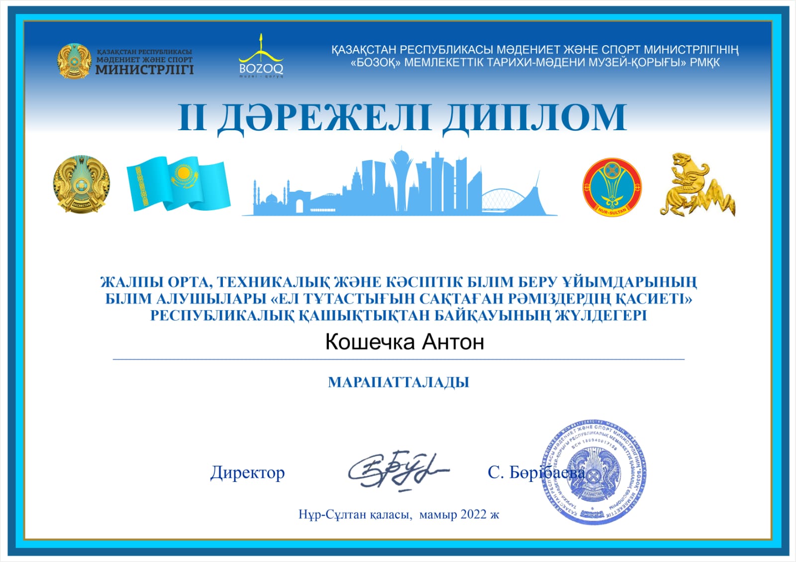 2022 жылғы 12 сәуір мен 30 мамыр аралығында ҚР Мәдениет және спорт министрлігі Мәдениет комитетінің "Бозоқ" мемлекеттік тарихи-мәдени музей-қорығымен "Ел тұғырын сақтаған рәміздердің қасиеті" атты республикалық қашықтық интернет-байқауы ұйымдастырылды.