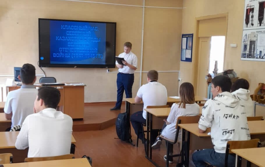 4 мамырда Т-21 тобында оқытушы И.А.Сергеева "Солтүстік Қазақстан Ұлы Отан соғысы жылдарында" тақырыбында сынып сағатын өткізді. Біздің облыс аумағында 1941 жылы 314 атқыштар дивизиясы құрылды. 1941 жылы 19 тамызда дивизия үш эшелонға тиеліп, Ленинград майданына жіберілді. Соғыс жылдары Қызыл Армия қатарына 70 мыңнан астам солтүстікқазақстандықтар шақырылып, 36 мыңға жуығы өнеркәсіпте жұмыс істеуге шақырылды. Петропавл эвакуацияланған 20 зауыт пен фабриканың жабдықтарын қабылдады. Жұмысшылардың орнын толтыру үшін ерлер орнына әйелдер, қарттар мен балалар келді.