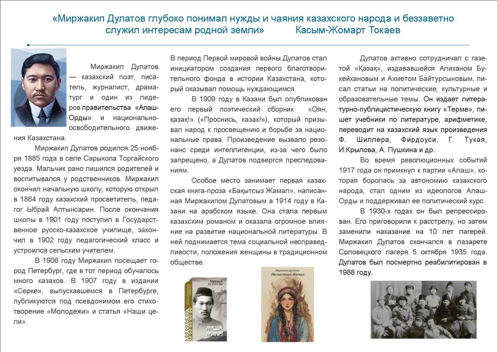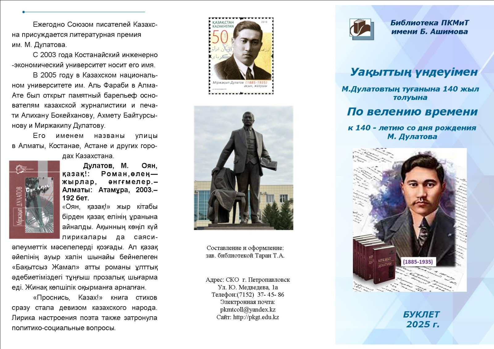 2025 жылдың 21 қарашасында Байкен Әшімов атындағы Петропавл машина жасау және көлік колледжінің кітапханасы «Оқу колледжі» тұжырымдамасы аясында Міржақып Дулатовтың туғанына 140 жыл толуына арналған «Уақыт үні» атты буклетті ұсынады. Мақсаттары: М.Дулатовтың өмірі мен шығармашылығын насихаттау, студенттердің оқу белсенділігін және оқу сапасын арттыру, олардың зияткерлік және рухани-адамгершілік дамуына ықпал ету. Міржақып Дулатов – қазақ ақыны, жазушысы, журналист, драматург, «Алаш-Орда» үкіметінің және Қазақстанның ұлттық-азаттық қозғалысының жетекшілерінің бірі. М.Дулатовтың бүкіл өмірі саяси қызметке, ағартушылыққа, жастарды тәрбиелеуге, туған жерге және халық дәстүріне деген сүйіспеншілікті қалыптастыруға арналды.