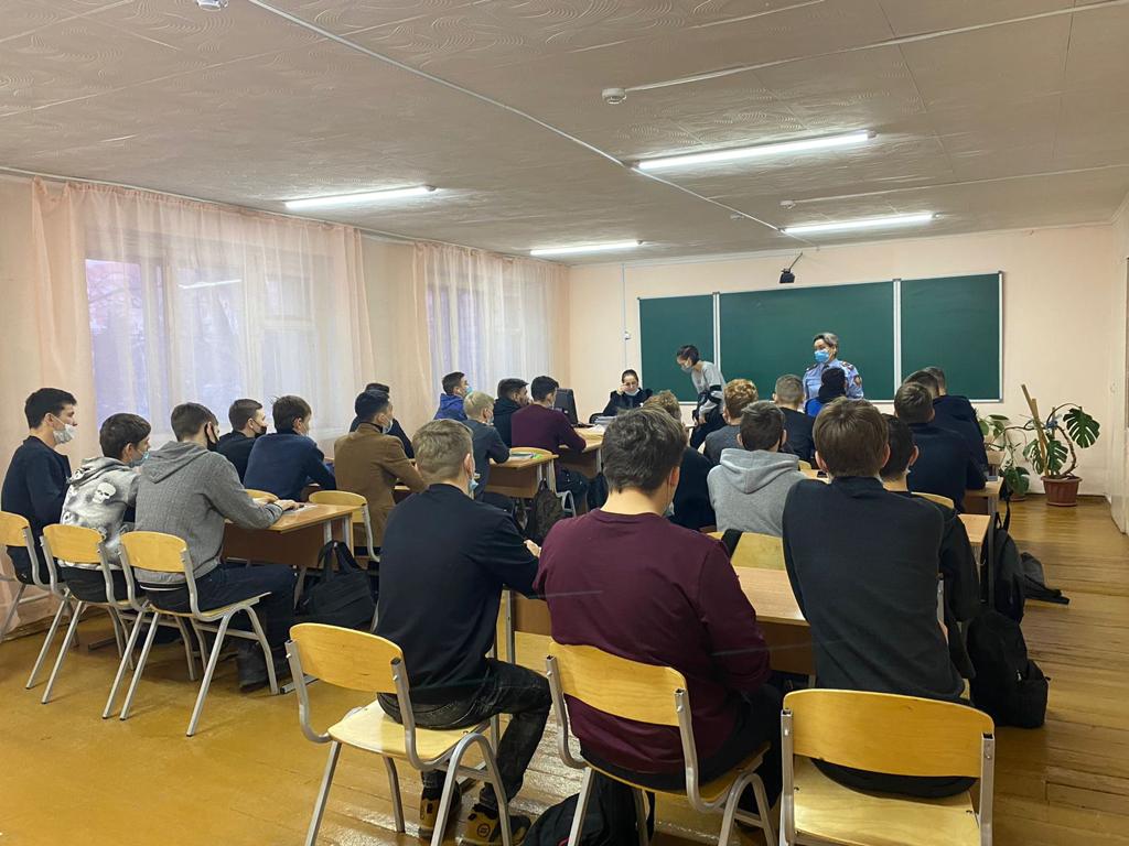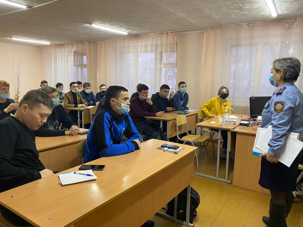 Полиция подполковнигі Б.Ө.Қасенова студенттерге құқық бұзушылық үшін жауапкершілік, құқыққа қарсы әрекеттердің себептері мен салдарлары туралы айтып, жастар жасаған құқық бұзушылықтар мысалдарын келтіріп, жазаның бұлтартпастығы қағидатын атап өтті. Әңгіме соңында студенттер өздерін қызықтырған сұрақтарын қойып, толық жауаптар алды.