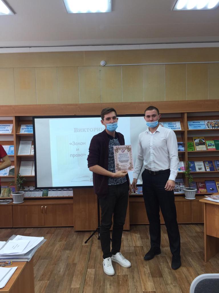 2021 жылдың 13 қазанында I курс студенттері үшін (Э-11, ДСП -11, Д -11 топтары) «Заң және құқық» тақырыбына викторина ұйымдастырылды. Негізгі мақсаты: кәмелетке толмағандар арасында қылмыс пен құқық бұзушылықтың алдын алу, студенттердің құқықтық санасын тәрбиелеу.