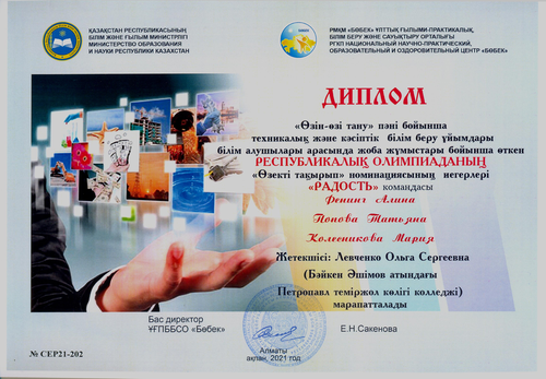 2021 жылғы 22-26 ақпан аралығында өзін–өзі тану бойынша Республикалық олимпиада өтті, оның ұйымдастырушылары «Бөбек» Ұлттық ғылыми-практикалық орталығы және «Өзін-өзі тану» Гуманитарлық колледжі болып табылады. Олимпиадаға Байкен Әшімов атындағы Петропавл теміржол көлігі колледжінің I курс студенттері қатысты: Фенинг Алина, Попова Татьяна, Колесникова Мария («Радость» командасы). Студенттер «Студенттердің адамгершілік сезімдерін тәрбиелеудегі еріктілер қозғалысының рөлі» жобасын әзірледі.