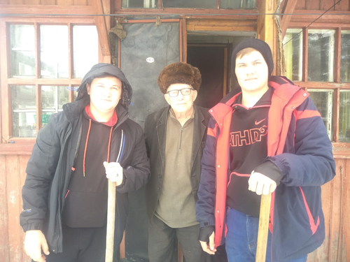 2020 жылдың 23 ақпанында Бәйкен Әшімов атындағы Петропавл теміржол көлігі колледжінің Л-23 топ студенттері Беззуб Эдуард, Гунгер Алексей, Плахотнюк Андрей –Белкин Георгий Филимоновичке көмек көрсетті. Зейнеткер жеке жер үйде тұрады және ауланың барлық аумағын қар басып кеткен. Студенттер күрекпен қаруланып, бірнеше сағат ішінде аулада жиналған қарды жинап үлгерді.
