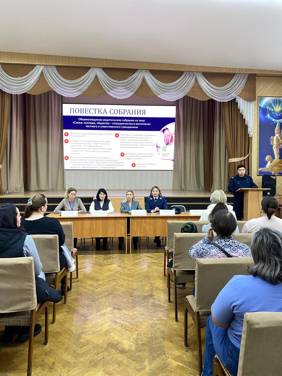 2025 жылғы 10 қазанда Байкен Әшімов атындағы Петропавл машина жасау және көлік колледжінде жалпы колледждік ата-аналар жиналысы өтті. Колледж директоры А.П.Фурманюк колледждің білім беру саясаты, оқыту мен тәрбиелеудегі басым бағыттар жөнінде жалпы ақпарат ұсынды. Колледж бен ата-аналар, мемлекеттік органдар арасындағы өзара іс-қимылды арттыру, студенттерге табысқа жетуге, сенімділік пен дамуға жағдай жасау, адал әрі жауапты азамат тәрбиелеу мақсатында жиналысқа келесі қонақтар шақырылды: Мустафина Ж.Ж. – полиция капитаны, Петропавл қаласы полиция басқармасының ювеналды полиция бөлімінің бастығы; Ильясова А.С. – полиция майоры, Петропавл қаласы полиция басқармасының отбасылық-тұрмыстық зорлық-зомбылықпен күрес бөлімінің бастығы; Майсеитов Б.К. – полиция аға лейтенанты, интернет-алаяқтық мәселелері бойынша криминалдық полиция бөлімінің қызметкері; Завьялова Е.Н. – Петропавл қаласы әкімдігі жанындағы Кәмелетке толмағандар ісі және олардың құқықтарын қорғау жөніндегі комиссияның хатшысы. «Біз біргеміз: колледж бен отбасындағы қолдау мен өзара түсіністік атмосферасы» тақырыбында ата-аналармен тренингтерді ППП орталығының психологтары А.А.Шаймерденова мен А.А.Мухамедина өткізді. Жиын соңында топ кураторлары мен өндірістік оқыту шеберлері оқу үдерісі мен сабақтан тыс өмірдің өзекті мәселелерін атап өтіп, студенттерді оқыту мен бейімдеу барысындағы қолдау жолдарын бірлесе талқылады.
