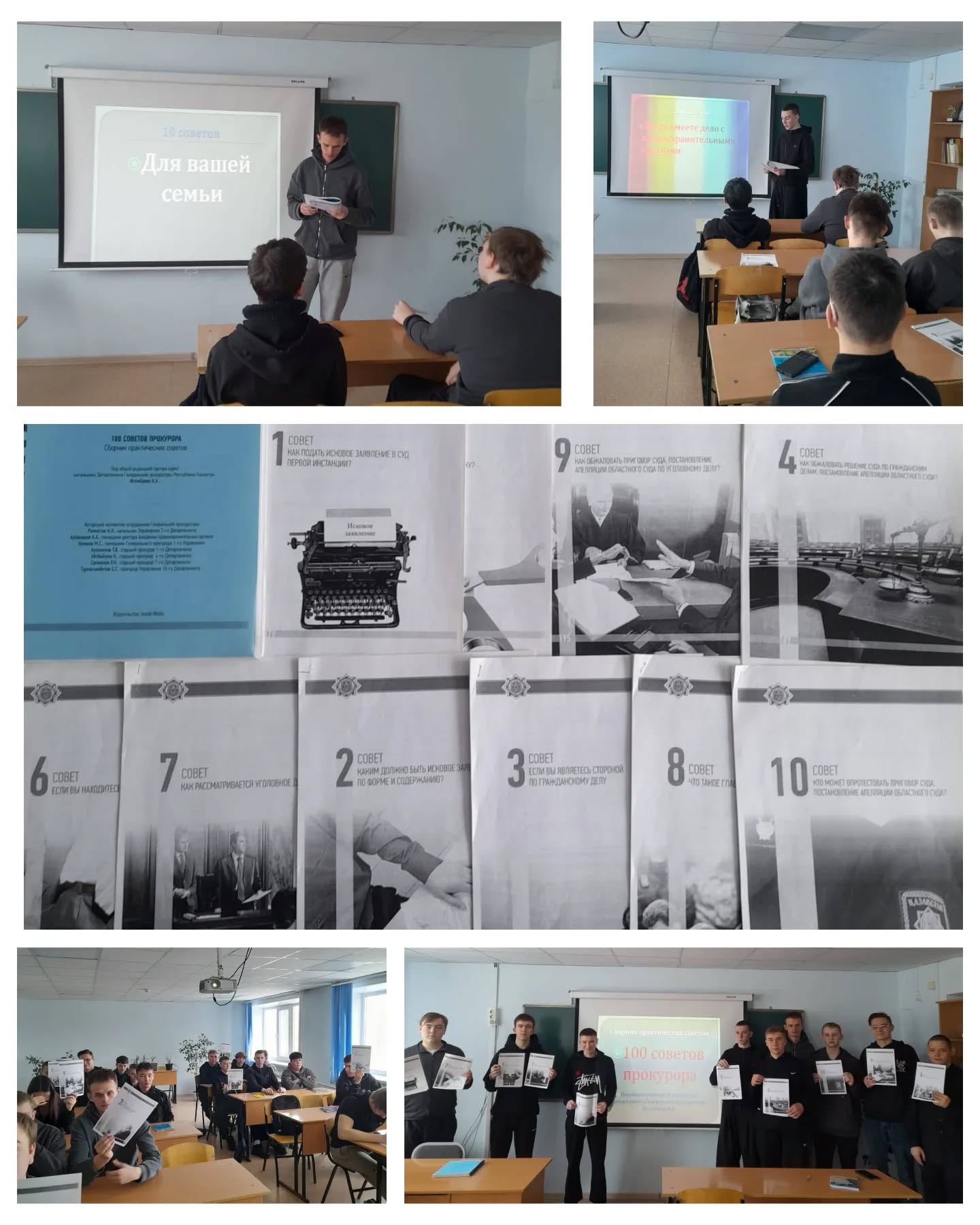 2026 жылғы 13 наурызда Б.Әшімов атындағы Петропавл машина жасау және көлік колледжінің 1-курс студенттері арасында, «Sanaly urpaq» құқықтық клубының өкілдерінің қатысуымен Қазақстан Республикасы Бас прокуратурасы департаментінің басшысы жалпы редакциялаған «Прокурордың 100 кеңесі» атты практикалық кеңестер жинағы талқыланды.