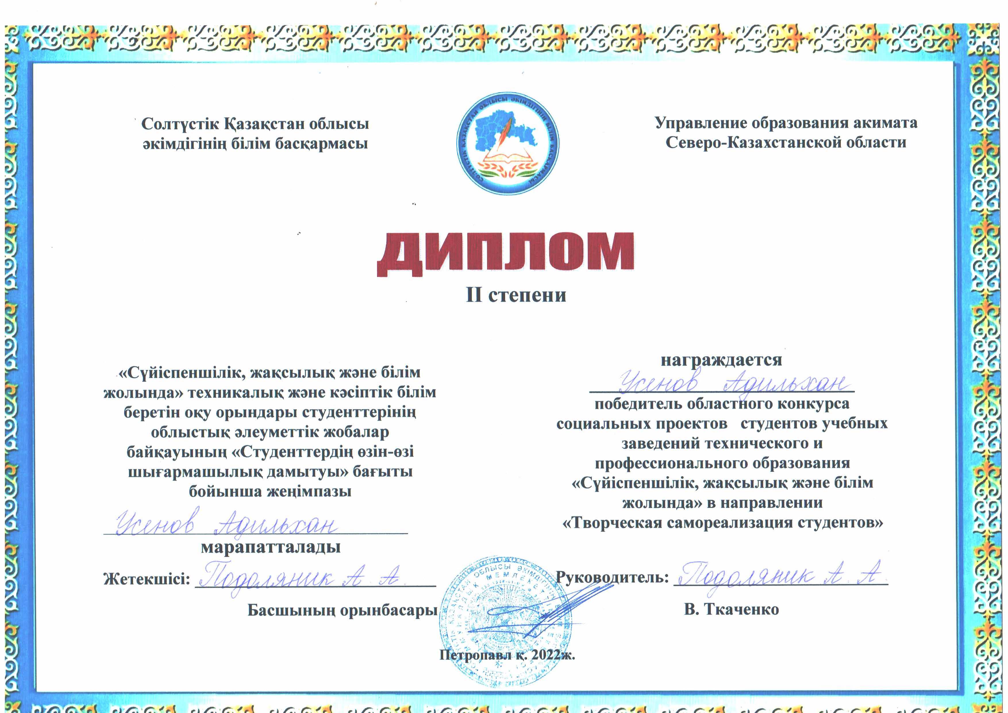 Student Parliament Club депутаты Үсенов Әділхан "IT технологияларды тереңдетіп қолдану арқылы жастар арасында салауатты өмір салтын насихаттау" әлеуметтік жобасы үшін "Студенттердің шығармашылық өзін-өзі жүзеге асыруы" номинациясы бойынша 2 дәрежелі дипломмен марапатталды.