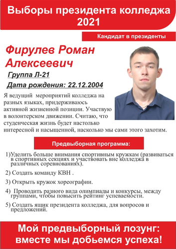 Сайлау науқанына 7 үміткер (кандидат) қатысты - Герман Виктор, Ларионова Эльвира, Феч Ангелина, Молдабаев Рахат, Пытьев Дмитрий, Үсенов Әділхан, Фирулев Роман. Бұл-белсенді өмірлік ұстанымы бар 1, 2 және 3 курс студенттері. Үміткерлер колледж өмірінің түрлі аспектілерін қамтитын сайлауалды бағдарламаларын ұсынды: оқу тәртібін және студенттердің білім деңгейін арттыру, спорт және салауатты өмір салты, мәдениет және еріктілік. Үгіт-насихат материалдары бас ғимараттың фойесінде, жатақханада, колледж сайтында, әлеуметтік желілер топтарында ақпараттық стендтерде орналастырылды. Дауыс беруге колледж студенттері мен оқытушылары қатысты.