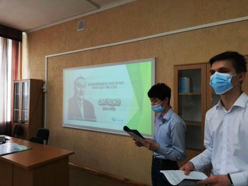 Студенттер назарына Сәбит Мұқановтың өмірі мен шығармашылығы туралы бейнематериал, оның шығармаларына шолу ұсынылды.