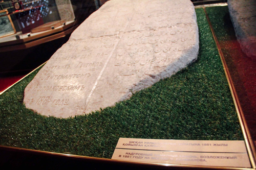 «Алтын-Емел» мұражайында сонымен қатар Екатеринбургте Түркістан өлкесінің генерал-губернаторы Константин Кауфманның бұйрығымен өз қаражатына жасалған қабір үсті мәрмәр тақтасы қойылды және 1881 жылы сәулетші Павел Зенковтың көмегімен этнографтың қабіріне орнатылды. Бұл тақтаның пайда болу тарихын алматылық өлкетанушы Николай Ивлев зерттеген. Сондай-ақ ол ондағы жазуды тас кескіш Леопольд Ластовский – поляк көтерілісіне қатысқаны үшін Верныйға жер аударылған поляк дворянының жазғанын білді. Уақыт өте келе Шоқан Уалихановтың зираты ұмытылуға ауыстырылды. Уақыт өте Шоқан Уәлихановтың бейіті ұмыт болды. 1906 жылы газетке куәгерлердің қабірден тек саз қоршау қалғаны, кесене толығымен қиратылғандығы туралы оқиға жарияланды. Кейінірек белгісіз біреу мәрмәр тақтаға шабуыл жасады, оған балға мен қашау іздері куә болды. 1989 жылы мәрмәр тақта көшірмеге ауыстырылды, ал түпнұсқасын Алтын-Емел мемориалдық мұражайынан көруге болады.