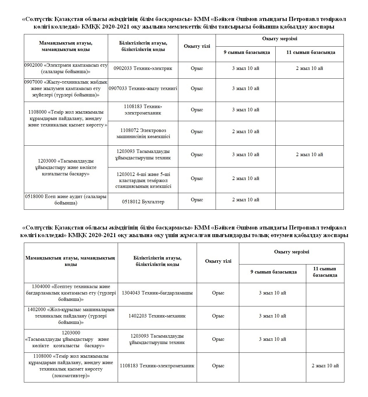 Бәйкен Әшімов атындағы Петропавл теміржол көлігі колледжі 2020-2021 оқу жылына қабылдау туралы хабарлайды.