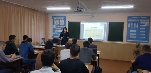 Бизнес-тренер Е. Коняхина студенттерге өз бизнесін қалай ашу керектігін, бизнесті жүргізудің заңды негіздері туралы ақпарат берді,маркетинг негіздерін, адам ресурстарын басқару, қаржылық құрамдауыштарды, персоналды басқару негіздерін үйретті.