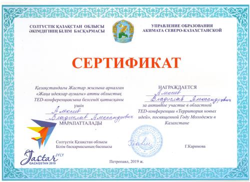 2019 жылы 24 сәуірде Мағжан Жұмабаев атындағы Петропавл гуманитарлық колледжінде Қазақстан жастарының жылына арналған «Жаңа идеялар аумағы» атты облыстық TED-конференция өтті. Колледж әкімшілігі конференция жұмысына белсенді қатысқан Э-43 тобының ІV курс студенті Алексеев Владиславқа алғыс білдіреді.