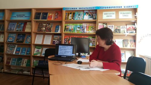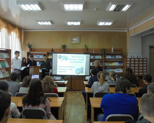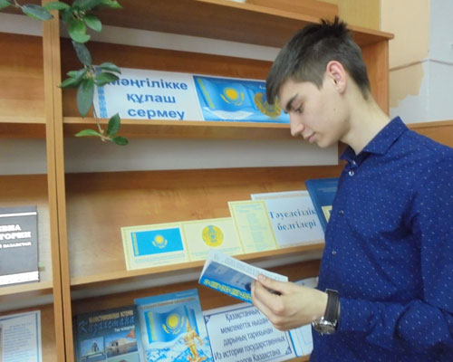 Интерактивті тақтадағы слайдтарда «Қазақстан Республикасының Мемлекеттік рәміздері» бейнефильмі көрсетілді, «Жаса Қазақстан» әнінің клипі көрсетілді. Кітапхананың оқу залында «Мәңгілік белгісі аясында» кітап көрмесі өтті.