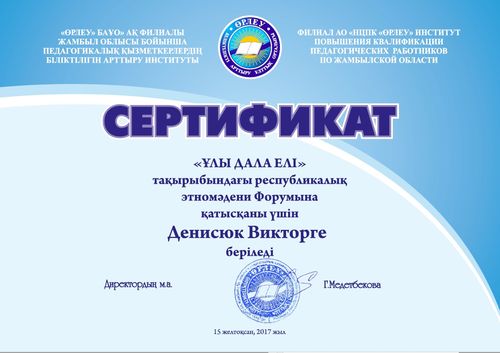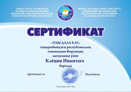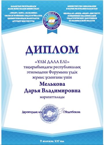 2017 жылғы 15 желтоқсан күні Тараз қаласында зерттеу жұмыстарының республикалық «ҰЛЫ ДАЛА ЕЛІ» атты этномәдени форумы onlinе-режимінде өтті. Форум Мемлекет басшысының «Болашаққа бағдар: рухани жаңғыру» бағдарламалық мақаласы аясында Қазақстан Республикасының Тәуелсіздігінің 26 жылдығына арналды. Форум мақсаты: Қазақстан халқының мәдениетін және ұлттық кодын сақтау үшін білім беру ұйымдарының оқытушылары мен білім алушыларының зерттеушілік және зияткерлік-шығармашылық әлеуетін дамытуға жағдай жасау.