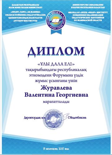 Зерттеу жұмыстарының жетекшісі Журавлева Валентина Георгиевна Дипломмен марапатталды.