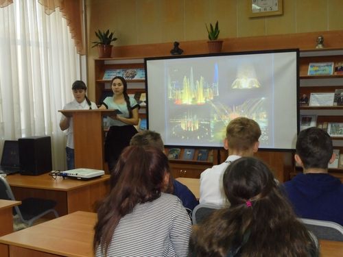 Студенттерге интербелсенді тақтада «Астана – 20 лет преображения» бейнефильмі, Н.Ә. Назарбаев сөзіне жазған «Город мой» өлеңінің бейнеклипі, слайдтар көрсетілді.
