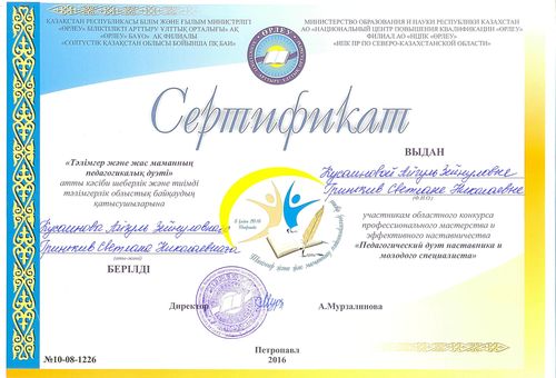 Біздің колледжіміздің оқытушыларынан тұратын педагогикалық дуэт Құсайынова Айгүл Зейнулқызы мен Гринькив Светлана Николаевнаға «Өрлеу» БАҰО АҚФ СҚО ПҚ БАИ директоры Алма Жәкімқызы Мырзалинова байқаудың «Ерекше дуэт» номинациясын анықтады.