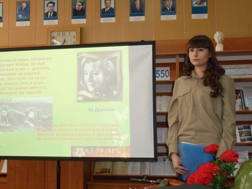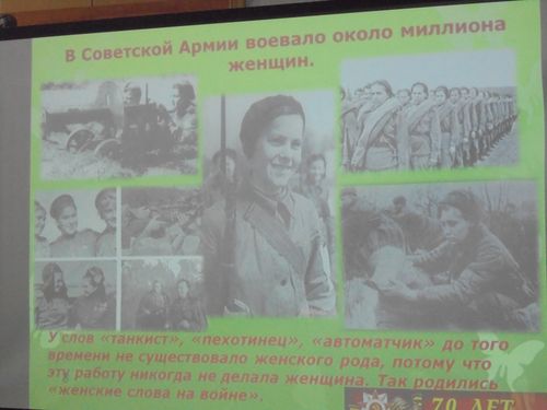 Жауынгер әйелдерге, тылда еңбек еткен әйелдерге А. Твардовскийдің, Ю. Друнинаның, А. Ахматованың патриоттық жолдары арналды. Олардың құрметіне алғыс сөздер айтылып, біздің Отанымыздың жарқын болашағы үшін жасаған ерліктеріне тағзым етілді.