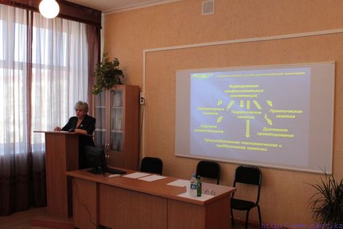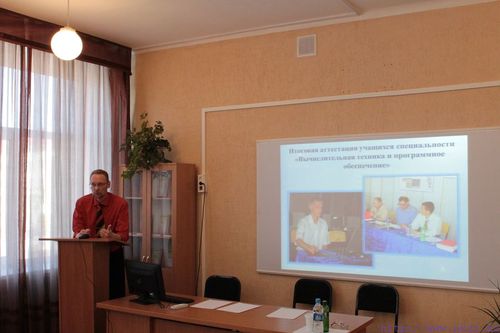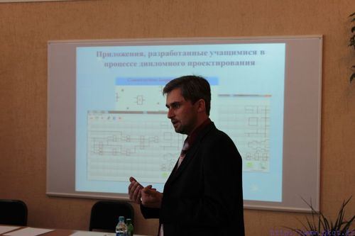ПТКК әдіскері И.Ю.Погребняк біздің колледжімізде курстық және дипломдық жобалауды ұйымдастыру кезінде кәсіптік құзыреттілікті қалыптастыру жөнінде баяндама жасады. Арнайы пәндер циклдік әдістемелік комиссиясының төрағасы Б.В.Шипулин мамандарды даярлаудың сапасын арттыру үшін дипломдық жобалауды ұйымдастыру кезінде әлеуметтік серік кәсіпорындармен бірлесе атқарылатын жұмыстар туралы әңгімеледі. Информатика және бағдарламалық қамтамасыз ету циклдік комиссиясының төрағасы В.В.Кревень және арнайы пәндердің оқытушысы П.Г.Вирко мамандық оқушыларының әлеуметтік серік кәсіпорындардың тапсырыстары бойынша нақты дипломдық жобаларды орындау тәжірибесімен бөлісті.